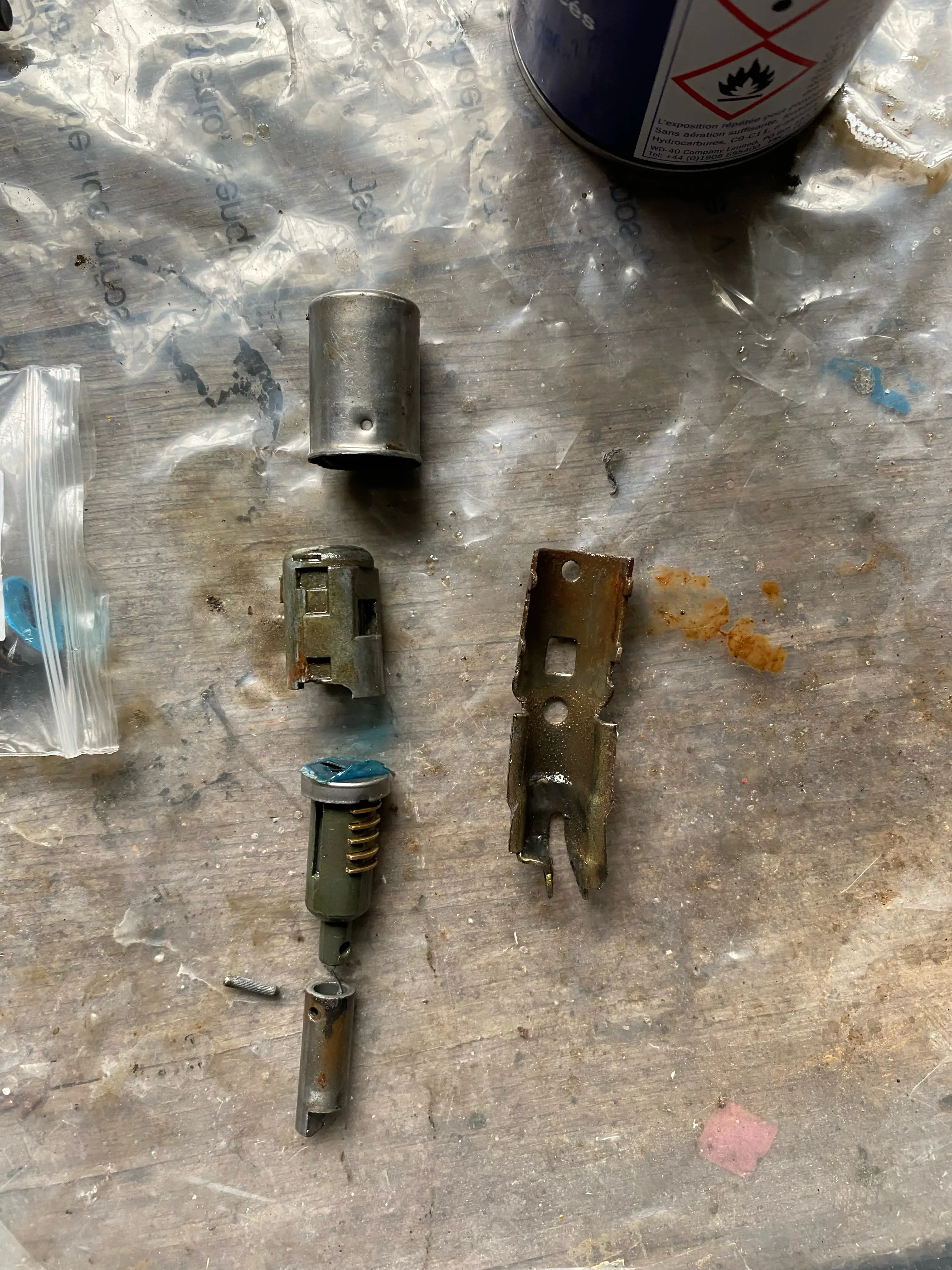 Après avoir galéré pour retirer la goupille accrochant le barillet au mécanisme de serrure, j'ai enfin accès au mécanisme