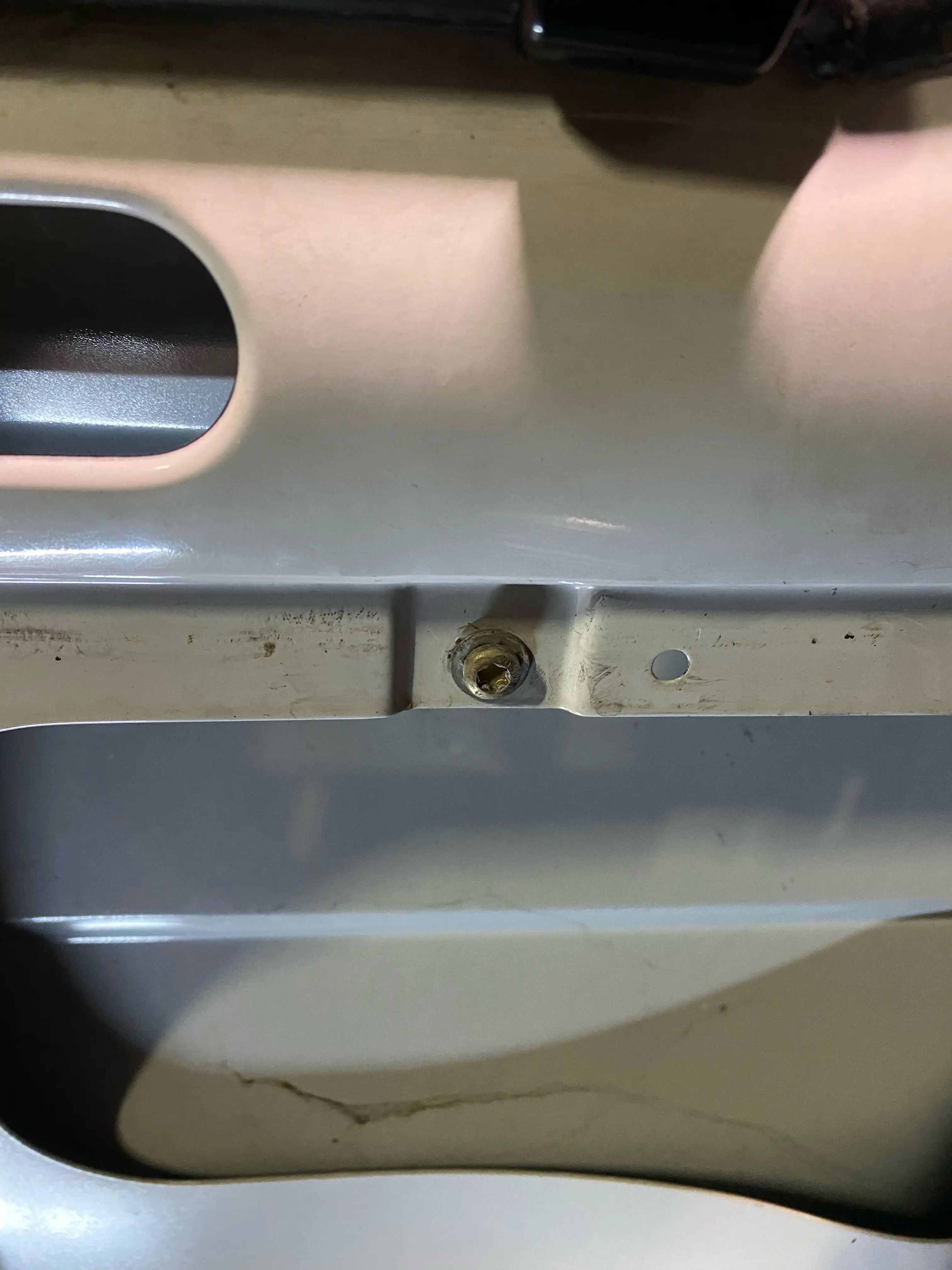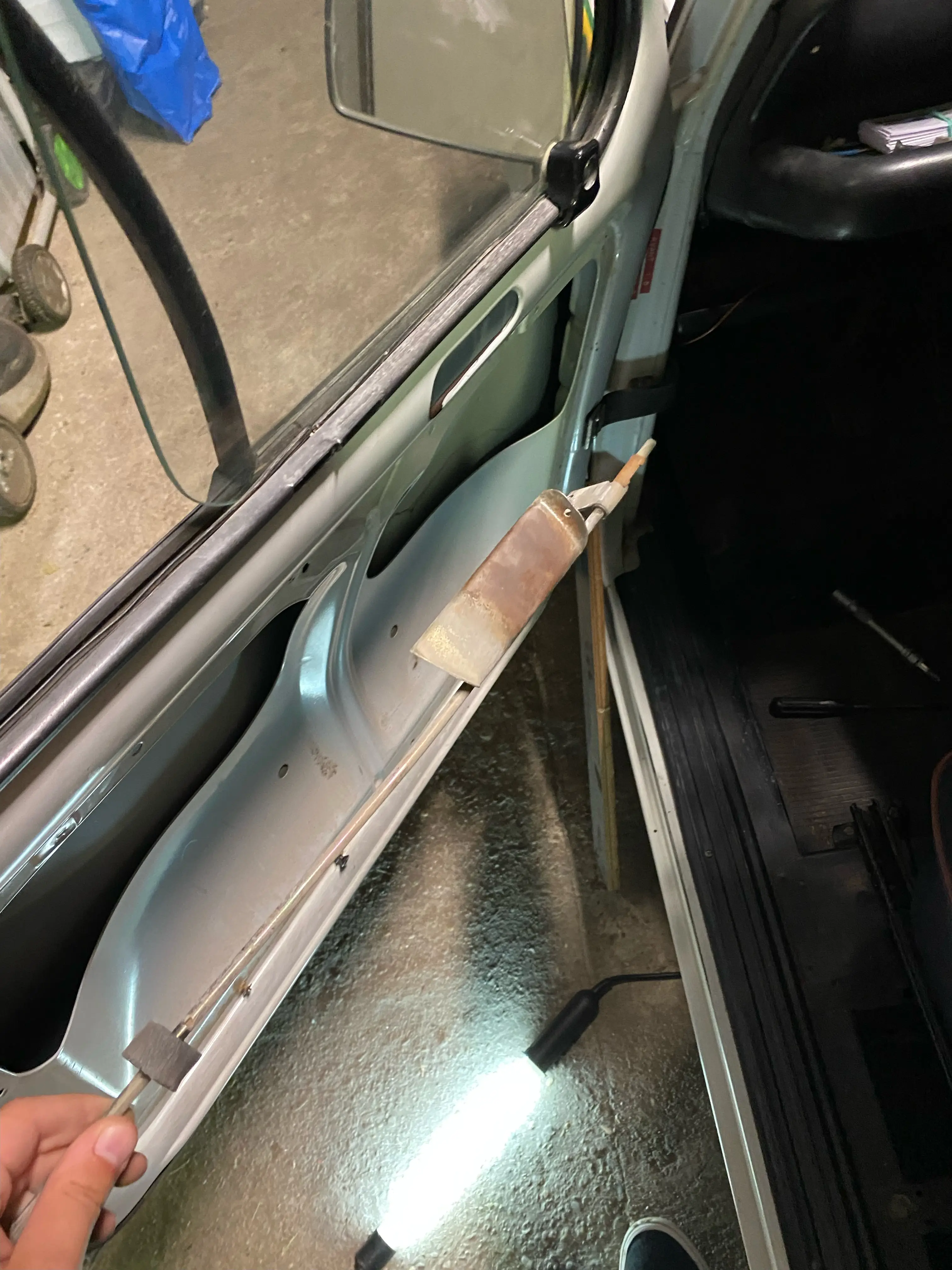 Pour retirer la tige qui tient fait office de poignée à l'intérieur tient aussi en place la serrure. Pour la retirer il suffit de retirer ce boulon et de la sortir en la glissant vers l'avant de la voiture.